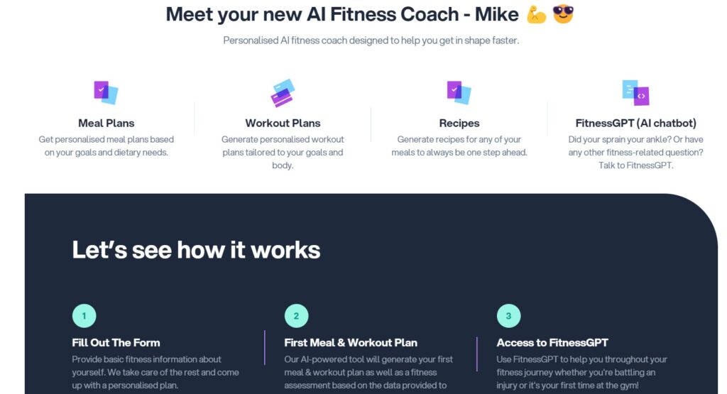 MikeAI acts as your personalized AI health and fitness coach. Get customized workout and meal plans tailored to your specific goals that adjust over time. Ask questions 24/7 to MikeAI’s FitnessGPT chatbot.